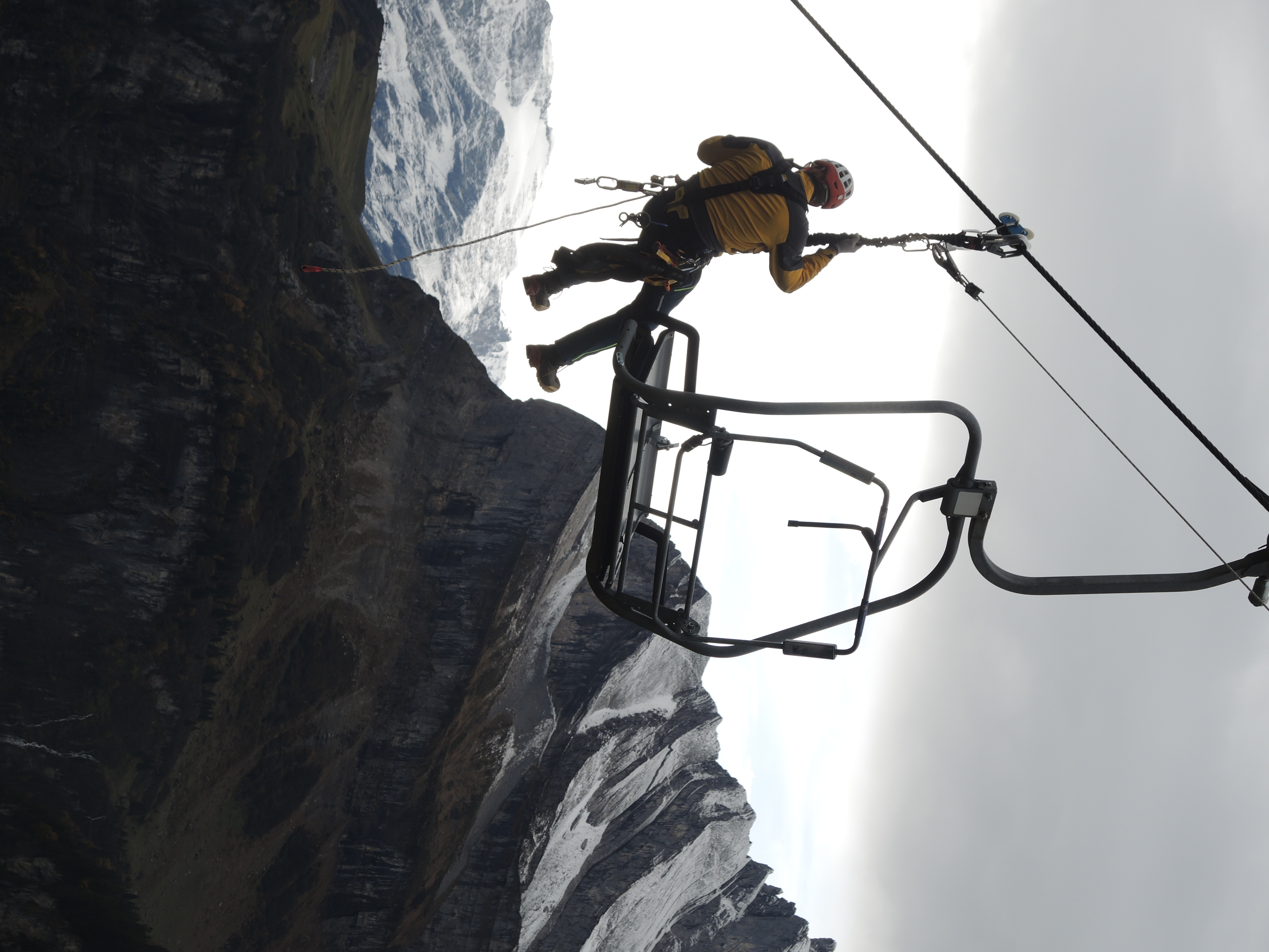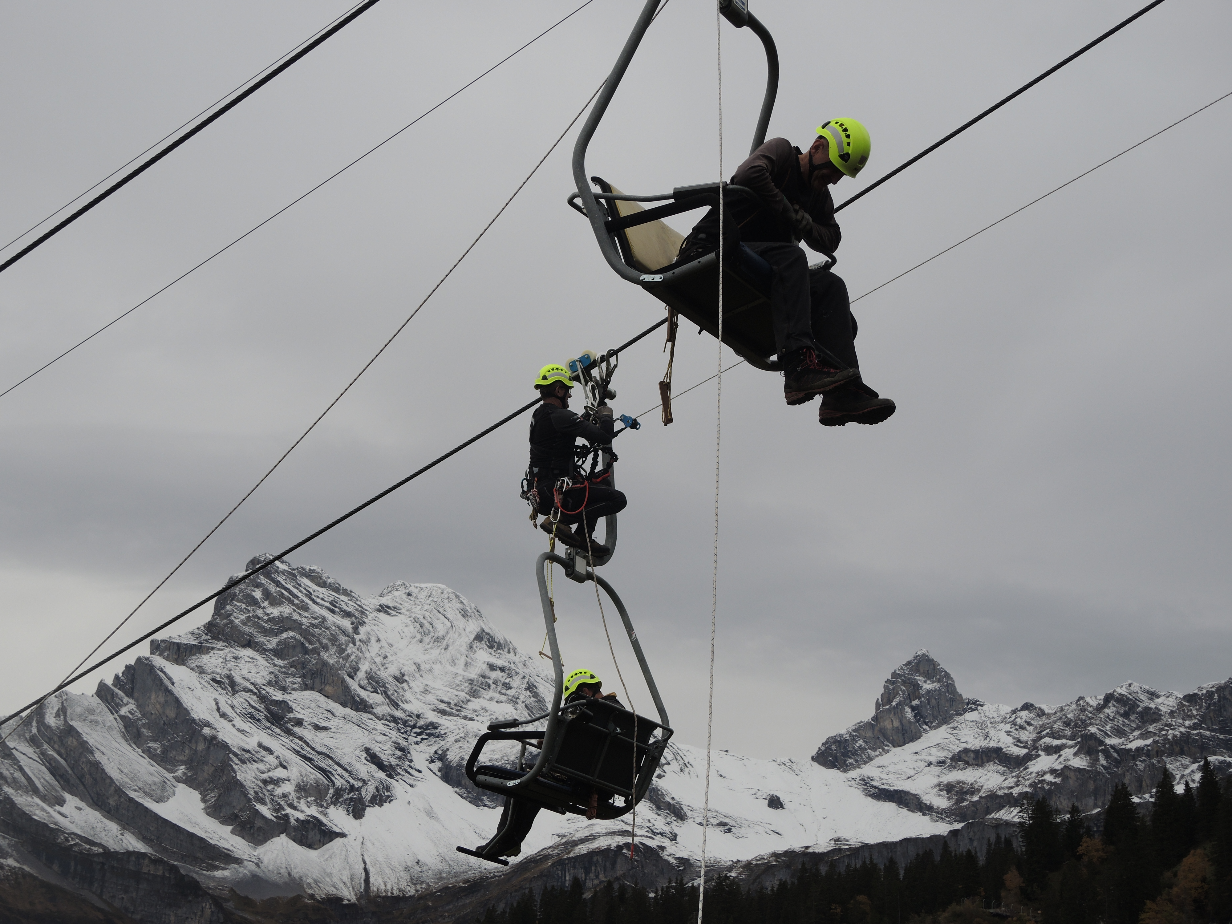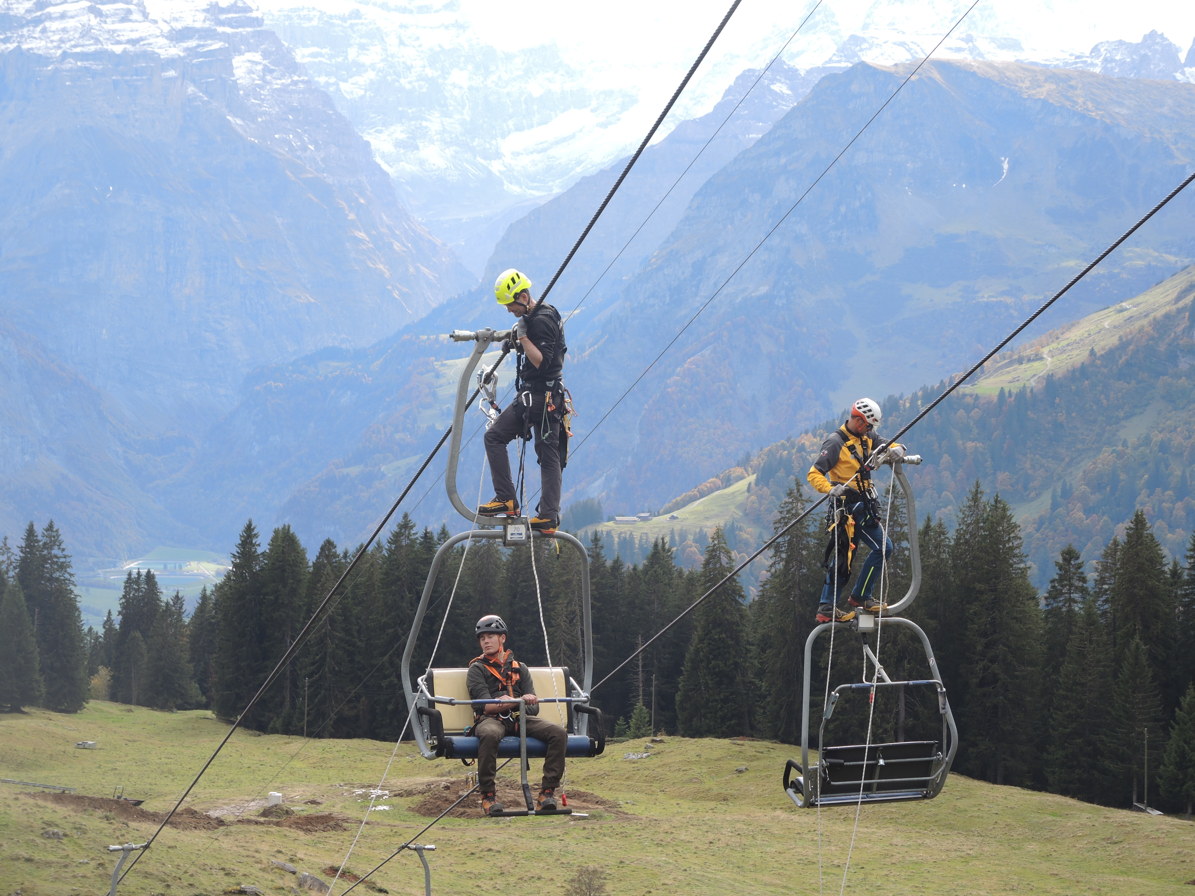 Wir unterstützen die Sportbahnen Braunwald als Partnerorganisation bei einer allfälligen Seilbahnevakuation. Für jede Anlage besteht ein detailliertes Rettungskonzept, welches alle Abläufe, Fristen und das erforderliche Rettungsmaterial beschreibt. Das Konzept fordert auch regelmässige Übungen an jeder Anlage. Im Herbst 2024 haben wir auf der Sesselbahn zum Seblengrat die Evakuation von Passagieren ab den Sesseln geübt.